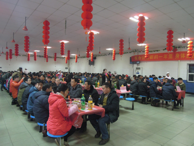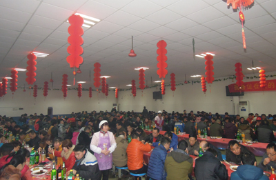 春節(jié)前夕,集團(tuán)公司行政、工會(huì)組織各事業(yè)部分工會(huì)對(duì)全體員工進(jìn)行摸底調(diào)查,最終確定留守杭州過年的有500多名外地單身員工,為了讓他們?cè)诤贾葸^一個(gè)歡樂、溫暖、祥和的新春,公司與往年一樣,為他們舉辦“同吃年夜飯,歡度除夕夜”活動(dòng)。為此,公司還在食堂掛起了大紅燈籠、彩帶等,增加了節(jié)日的喜慶氣氛。
