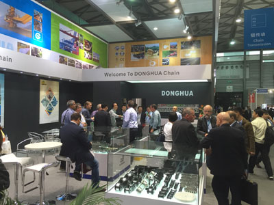 展會中,東華的宣傳片作為唯一一家企業(yè)的宣傳品在展會主大廳大屏幕循環(huán)播放,過道上也是由東華的醒目LOGO裝飾,吸引了廣大客戶的目光。今年中國鏈傳動件設(shè)在N5展館,東華展廳120多平方米,設(shè)計新穎、大氣,觀眾一走進展廳,便被豐富齊全、造型各異的精美鏈條所吸引,展品有最新生產(chǎn)的各類高、精、尖傳動鏈、輸送鏈、農(nóng)機鏈、工程鏈等,特別是從德國公司送來參展的大型鋼廠輸送鏈,造型新穎,吸引了絡(luò)繹不絕的客戶和觀眾參觀。