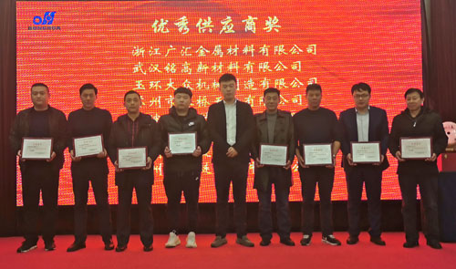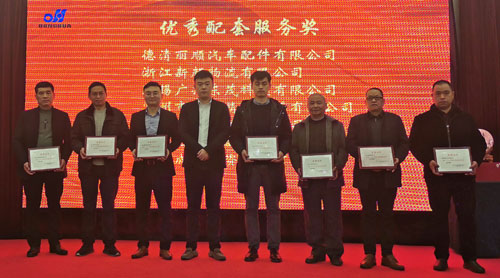 會(huì)上,副董事長宣成向2019年度優(yōu)秀供應(yīng)商和獲得優(yōu)秀配套服務(wù)獎(jiǎng)的企業(yè)代表頒獎(jiǎng),并合影留念。優(yōu)秀供應(yīng)商代表,浙江廣匯金屬材料有限公司總經(jīng)理沈永躍上臺(tái)作了熱情洋溢的發(fā)言。優(yōu)秀配套服務(wù)獎(jiǎng)代表德清麗順汽車配件有限公司總經(jīng)理趙國民上臺(tái)作了熱情洋溢的發(fā)言。