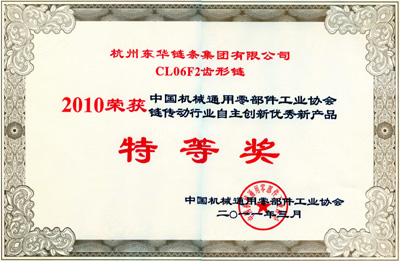 會上,中國機械通用零部件工業協會對2010年自主創新先進企業及自主創新優秀新產品進行表彰。東華集團被授予“2009~2010年度自主創新先進企業”榮譽稱號;東華集團生產的“PT100SLR免維護梯級鏈”和“CL06F2齒形鏈”榮獲中國機械通用零部件工業協會鏈傳動行業自主創新優秀新產品特等獎;另有5個新產品榮獲自主創新優秀新產品優秀獎。董事長助理、黨委書記張世強上臺領獎。