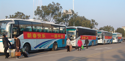 1月31日下午5:30分,五輛(安徽合肥線、安徽六安線、河南鄭州線、江西廣豐線、江西南昌線)貼著:“新春快樂、一路平安”橫幅的長途大客車在東華集團自強公司門口一字排開,滿載著250多名老家在這些區域的員工返鄉過新年。