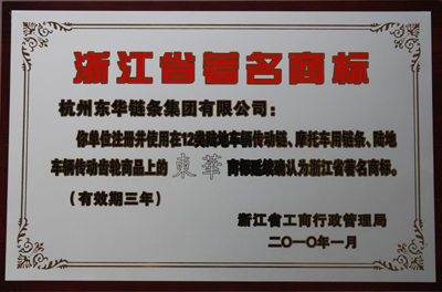 日前,東華集團注冊并使用在12類陸地車輛傳動鏈、摩托車用鏈條、陸地車輛傳動齒輪商品上的“東華”商標被浙江省工商行政管理局復(fù)評為浙江省著名商標。