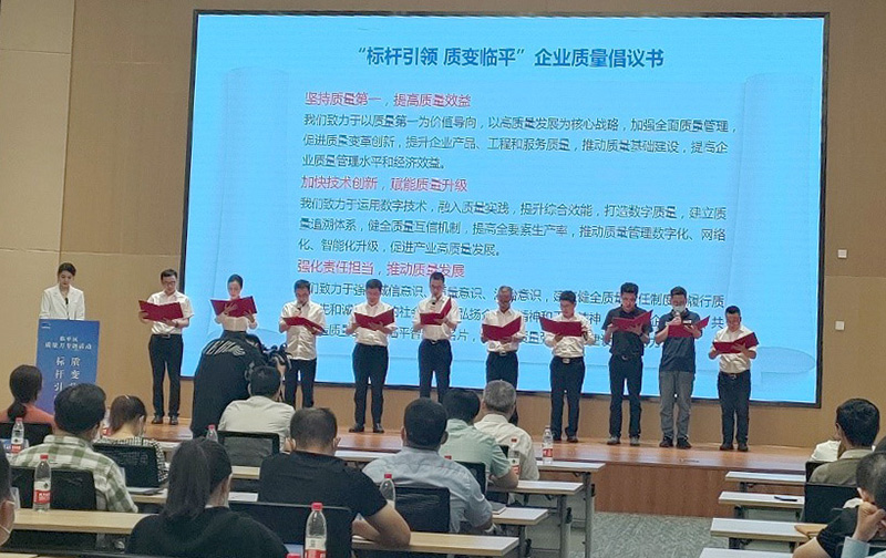 9月16日,臨平區(qū)質(zhì)量強區(qū)領(lǐng)導(dǎo)小組辦公室組織召開“標桿引領(lǐng),質(zhì)變臨平”質(zhì)量月專題活動。東華作為區(qū)政府質(zhì)量獎企業(yè)應(yīng)邀參加“臨平質(zhì)量故事”分享,副總經(jīng)理廖杭州上臺宣讀了“標桿引領(lǐng),質(zhì)量臨平”企業(yè)質(zhì)量倡議書。