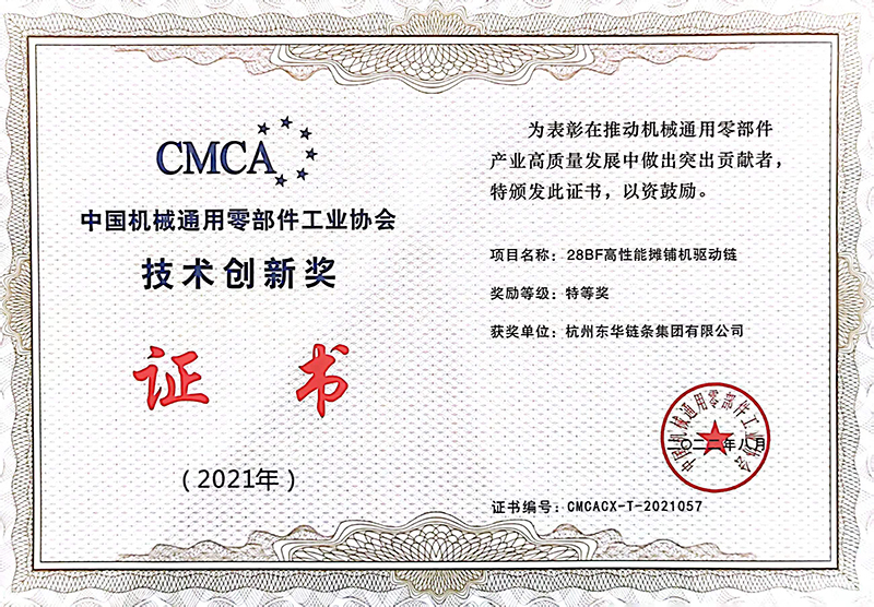 東華鏈條榮獲特等獎、優秀獎各5項。5項特等獎分別是:東華鏈條集團開發的28BF高性能攤鋪機驅動鏈、東華興化公司開發的32BSPF高精度高耐磨鏈條、盾牌公司開發的P224.7F1驅動輸送鏈和M224F-S-250地拖輸送鏈、自強公司開發的C-24SSLR自潤滑梯級鏈條;5項優秀獎產品及高端裝備分別是:東華鏈條集團開發的2.0T汽車發動機用靜音鏈條、東華興化公司開發的C2062HSSGR高耐磨輸送鏈、盾牌公司開發的P200F280K2輸送鏈、HB50.5F41空心銷軸鏈條鉚頭機和PO152F48棕櫚油輸送鏈裝配機。