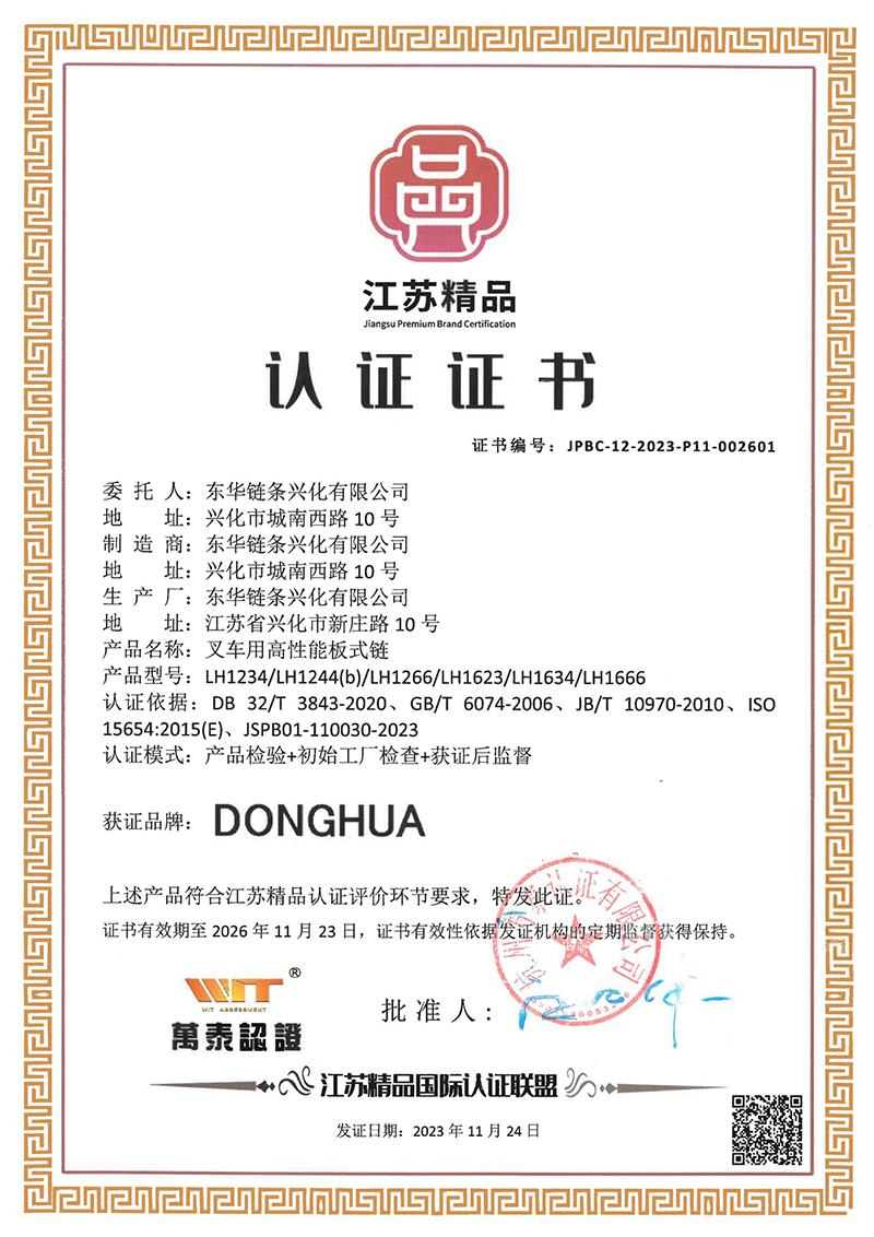 近日,東華鏈條興化有限公司叉車用高性能板式鏈獲得由江蘇精品國際認證聯盟頒發的“江蘇精品”認證證書,這是板式鏈產品繼“浙江制造”品字標的又一項榮譽,是板式鏈產品從2022年開始在江蘇興化工廠制造的第一項省級榮譽。