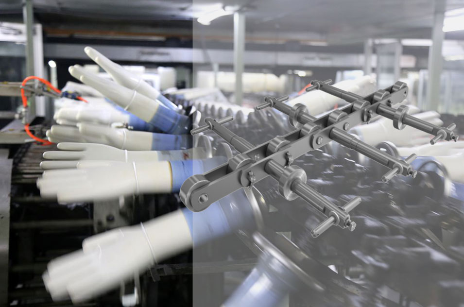 ● 橡膠手套鏈已經形成系列化產品,通過特殊設計,滿足橡膠手套生產線更長、更快、優質高效的制造需求。