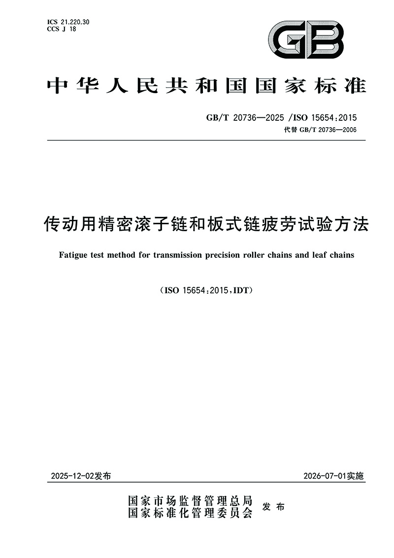 新版GB/T 20736—2025等同采用國際標準ISO 15654:2015,由吉林大學鏈傳動研究所與東華鏈條集團等單位共同起草,東華旗下杭州盾牌鏈條、興化公司參與研制。該標準明確了傳動用滾子鏈和板式鏈的軸向加載疲勞試驗方法,規定了試驗統計分析與報告格式,并在2006版基礎上新增了多排鏈條和板式鏈的疲勞試驗內容。