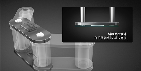 | 1)鏈板外凸設(shè)計(jì),保護(hù)銷軸頭部,減少磨損; | 2)銷軸表面硬化處理,提高使用壽命。 |